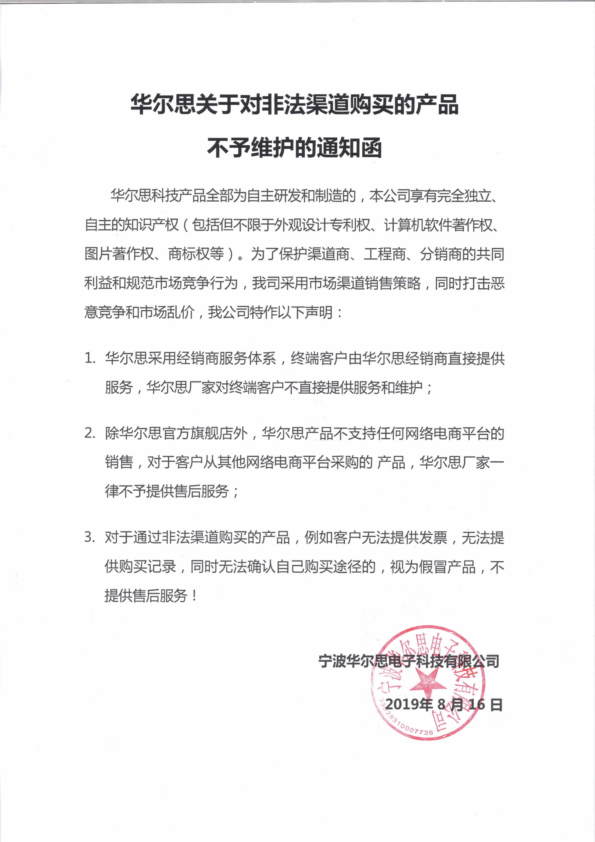 華爾思關(guān)于對(duì)非法渠道購買的產(chǎn)品不予維護(hù)的通知函