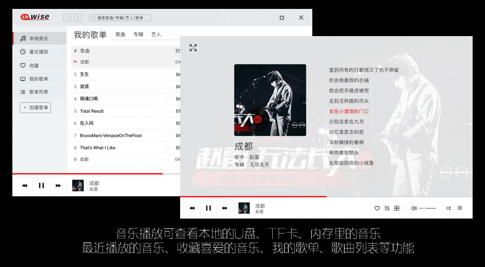 第一屏是主界面,音樂播放界面模塊化,可顯示天氣、日歷、時間等、可以進行音視頻的選擇、分區(qū)選擇、音源選擇等。